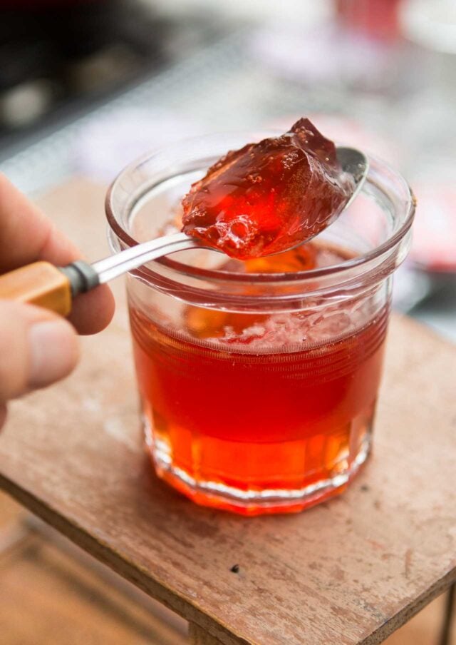 Cook until the temperature reaches 220ºF (104ºC). At that point, turn off the heat and begin testing the jelly on a chilled plate in the freezer, using the method mentioned in the headnote. When it wrinkles and holds its shape, it’s done. If not, continue to cook and re-test it at intervals. This batch set at 230ºF (110ºC).