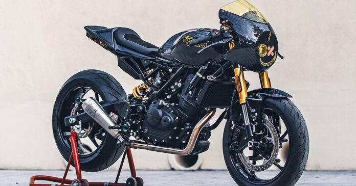 Buraq’s plan called for an overhaul of both the Guerrilla’s bodywork and its running gear. The OEM subframe was unbolted and replaced with an exceedingly tidy trellised unit. A carbon fiber seat cowl was then draped over the top, taking cues from classic muscle bikes.