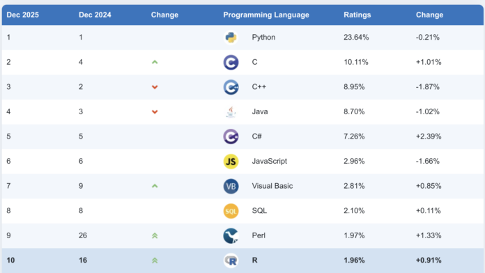 There were murmurs that R was on the way down, but this year R rose back up from 16 to 10, based on the TIOBE Index, which tracks the popularity of programming languages.