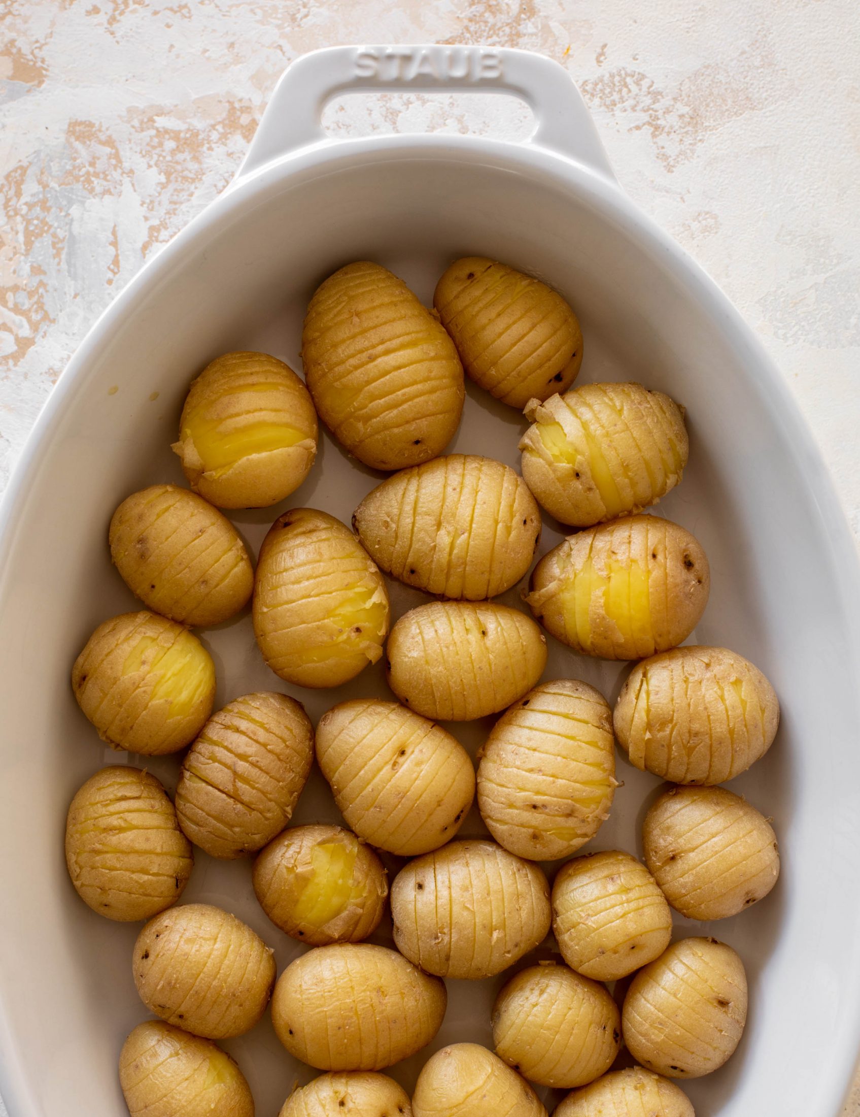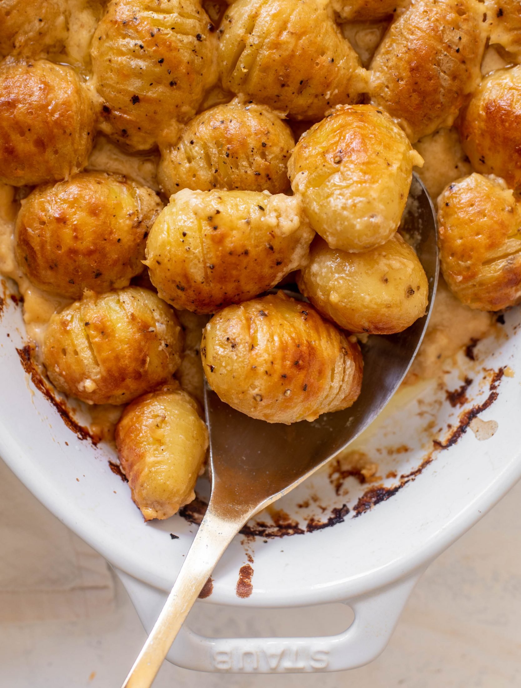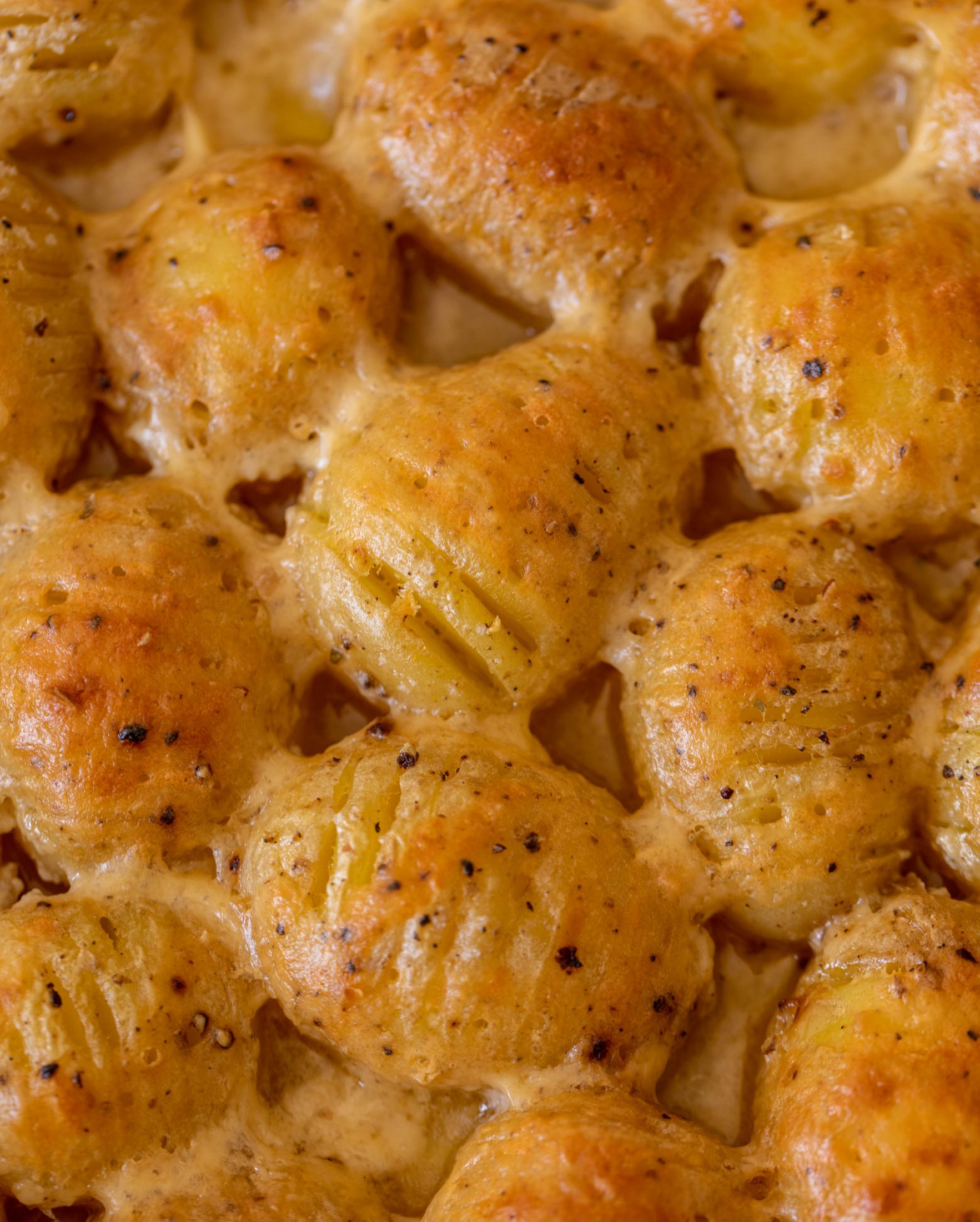 If you’re really feeling frisky, you can stuff something tiny into the mini hasselback potatoes. Like maybe a small slab of garlic butter or even a shred of cheese. But trust me, the quick bechamel is doing the work for us here.Â