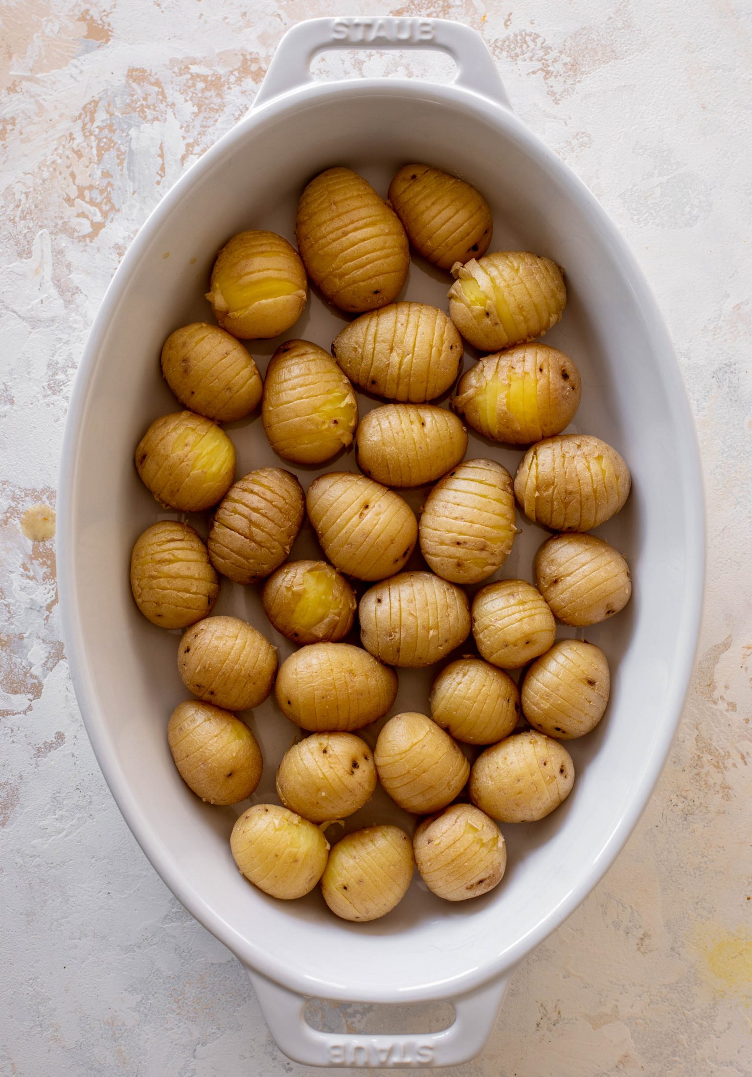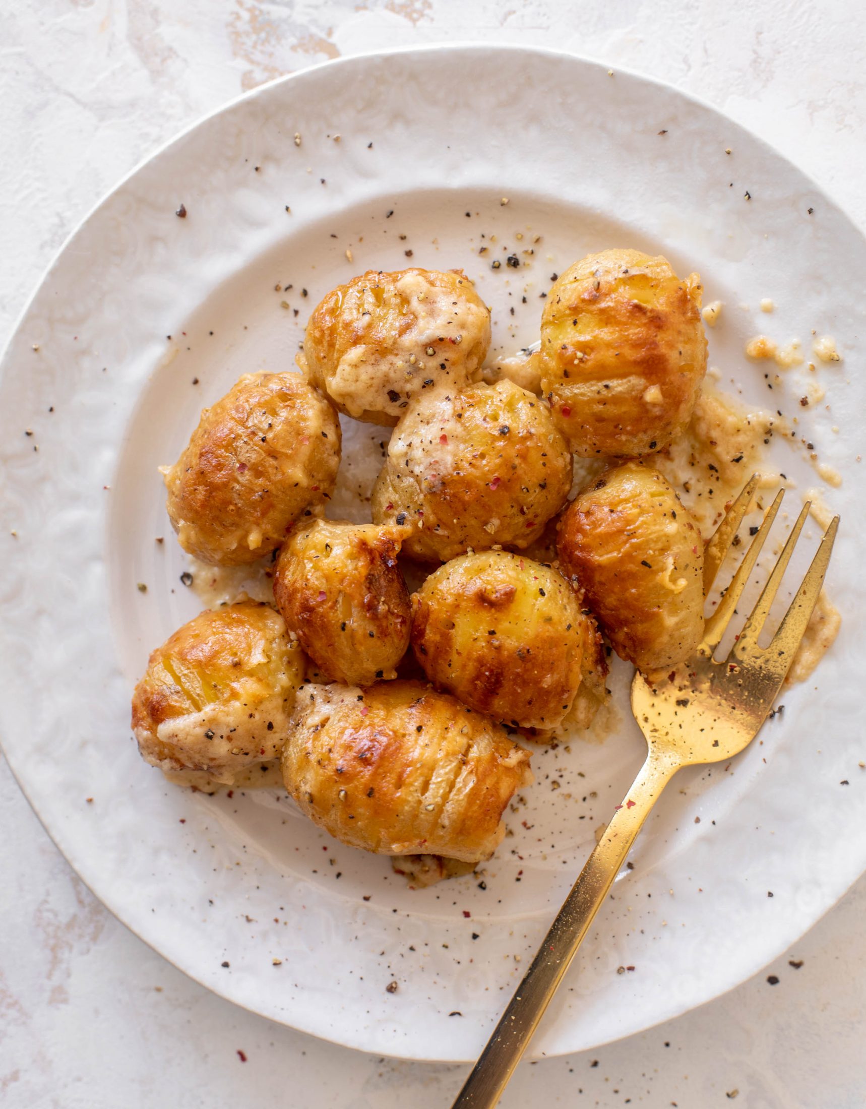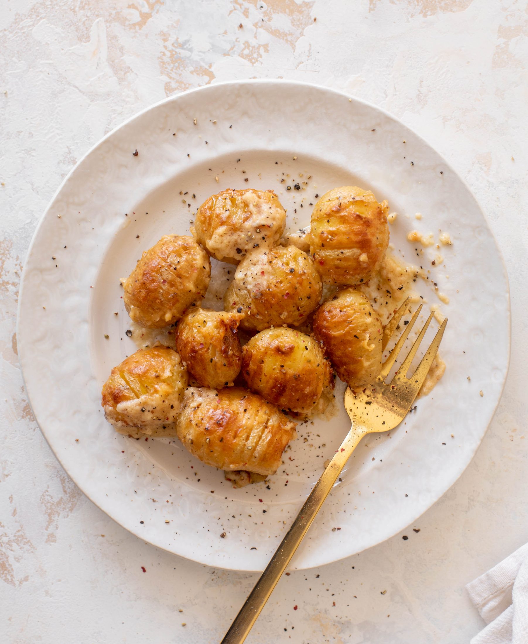 If you’re really feeling frisky, you can stuff something tiny into the mini hasselback potatoes. Like maybe a small slab of garlic butter or even a shred of cheese. But trust me, the quick bechamel is doing the work for us here.Â