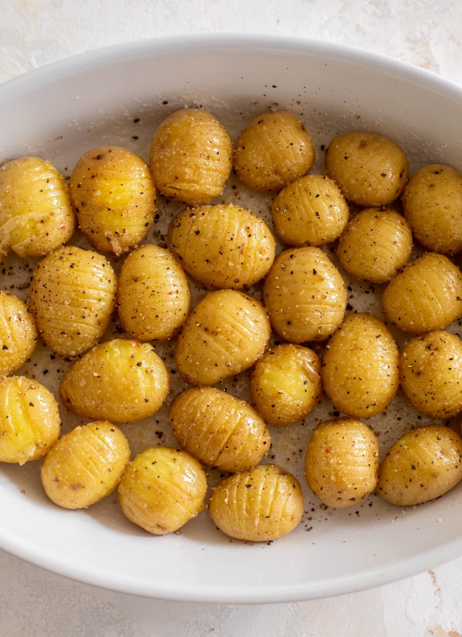 I adore any version of hasselback potatoes. These big ones with caramelized onions? Heck yes. They are already a holiday staple around here. But somehow I got a bright idea to make hasselback potatoes with MINI potatoes.
