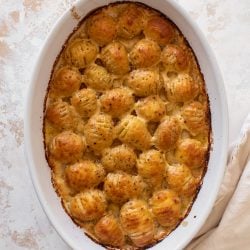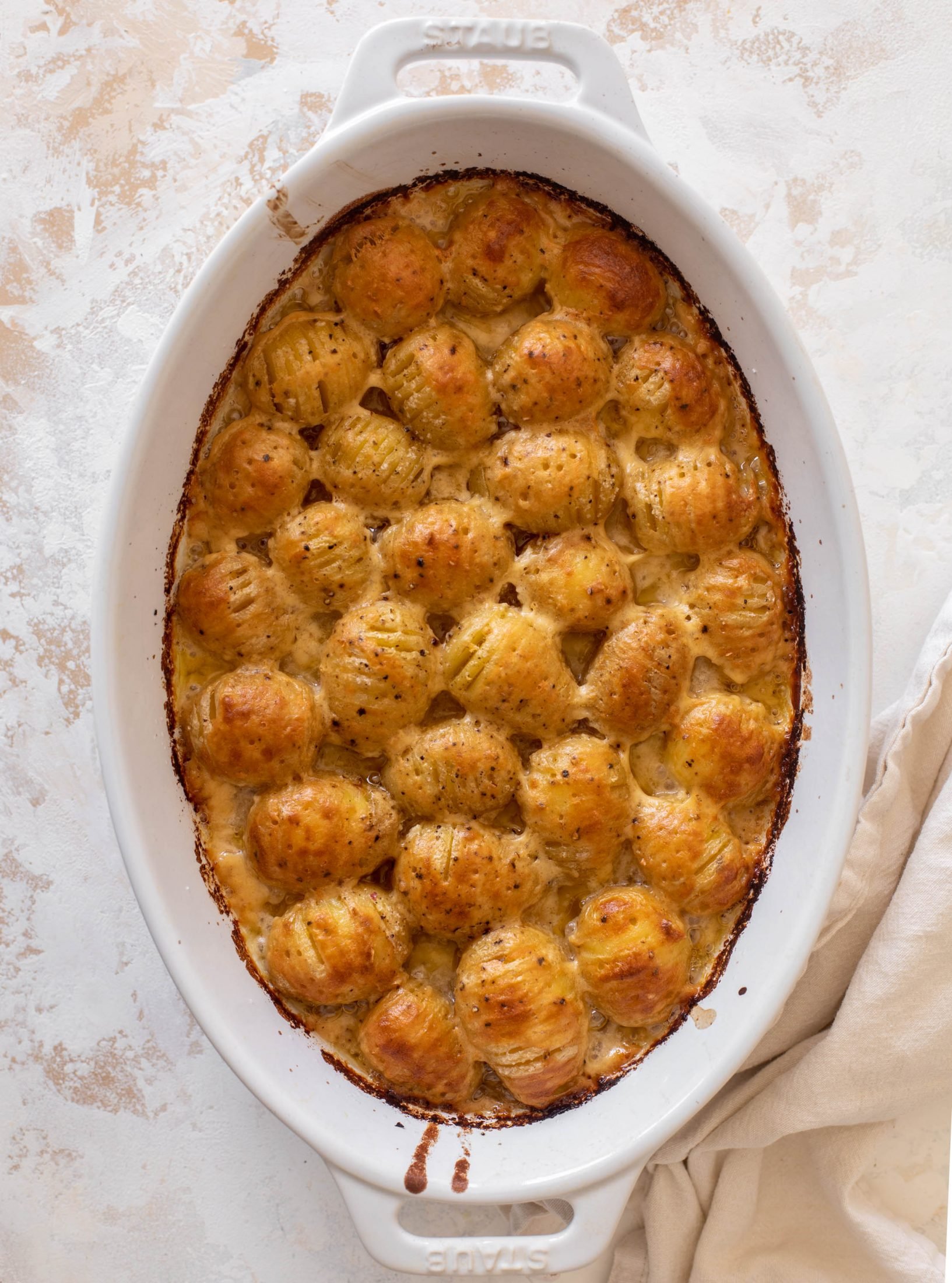These scalloped hasselback potatoes are made with mini gold potatoes, sliced super thin, roasted until crisp and then baked in a cheesy bechamel sauce. They are a decadent, delicious side dish that is beautiful too!Â